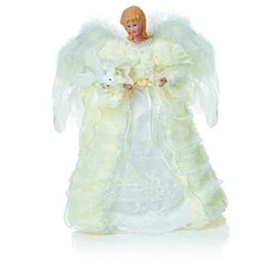This decorative white angel tree topper has been designed to sit on top of your tree or can free stand as an ornament. Porcelain face, featuring feathered wings, lace detail and holding a dove on her sleeve. Mixed materials have been used to create a detailed dress. Plastic inner.. Approximate dimensions; H30 x W20 x D9cm