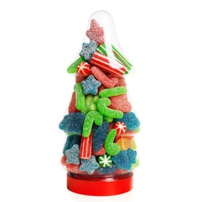 FESTIVE CHRISTMAS GIFT IDEA – Delight friends, family, and kids with this Christmas-tree-shaped jar packed with bright, festive sweets — a perfect ready-to-gift treat. CHIRSTMAS ASSORTMENT 360g - available delicious mix of 360g xmas treats filled in xmas tree container COLOURFUL SWEET MIX – Includes a fun variety of chewy gummies, candy canes, stars, and festive shapes coated in sugar — loved by kids and adults alike. READY TO GIFT – NO WRAPPING NEEDED – Comes in a decorative tree-shaped clear container with a red lid — ideal for stocking fillers, party favours, or festive hampers.