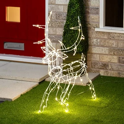 LIGHT UP REINDEER – This festive light-up prancing reindeer is a wonderful outdoor Christmas decoration to illuminate your gardens, patios, and driveways this Christmastime. ENERGY EFFICIENT - This electrical Christmas reindeer won't cost a fortune to run, and based on the October energy price cap of 34p p/kWh will cost you around 0.12p per hour, which equates to just 5 pence per week, based on the lights being left on for a full 6 hours a night! PERFECT SIZE – The reindeer stands 72cm tall, and has a body measuring 70cm in length, making it a stand out Christmas decoration, and brilliant focal point for your front or back garden. EASY TO ASSEMBLE – The light-up reindeer comes in 2 separate pieces which easily slot together to make assembly a breeze. The unit also comes with 4 ground spikes to ensure the reindeer doesn’t fly back to the North Pole! LED LIGHT BULBS – The Christmas reindeer is illuminated by 110 micro warm white LED light bulbs, and is mains powered with a 5m wire. PLEASE NOTE for safety the transformer and power box need to remain dry and protected indoors at all times.