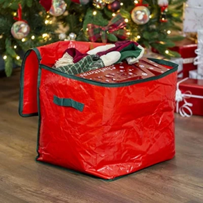 CHRISTMAS BAUBLE STORAGE BAG - Store all your beloved Christmas ornaments safely and securely in one place with this storage bag that protects from dust, scratching or shattering so they can remain in excellent condition. HUGE CAPACITY WITH DIVIDERS - With four layers, you can safely store up to 64 decorations in individual compartments, while the side handles make quick work of locating and retrieving them. With dimensions of 35 x 35 x 35cm, the bag is suitable for baubles of up to 8cm in diameter. EASY TO ASSEMBLE AND TRANSPORT – The durable bag is made from non-woven fabric and heavy-duty cardboard dividers to ensure ornaments will last many seasons to come. It has a festive red body and green handles, standing out to help you easily locate it and allow you to hold, hoist, and move it with ease! AVOID DAMAGES OR DUST – Avoid scratching or abrasing your sentimental decorations by using this bag, which keeps your baubles in one convenient place for when you need them. When not in use, the bag can be flattened for storage. CHRISTMAS WORKSHOP – The Christmas Workshop is the leading supplier of all things Christmas related. From Christmas trees & festive ornaments, to fairy lights and projector lights, you can find everything to decorate your home at the Christmas Workshop Amazon page.