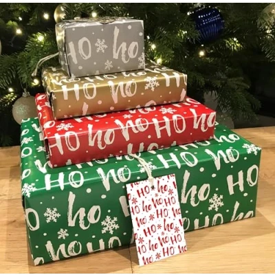 Christmas Wrapping Paper. 8 XL Sheets (50 x 70cm). HoHoHo Design in 4 Colours Including Metallic Silver and Gold. Gift Wrap Pack with Matching Tags. Cutting Grid on Reverse.