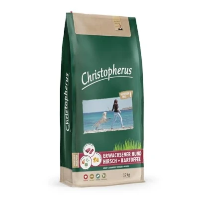 For adult dogs with normal activity (depending on breed): dry food with high protein content for the special nutritional needs of adult dogs Balanced protein and fat content to prevent protein sensitivities and feed intolerances, pure animal protein supplier, without gluten-containing cereals Low crude ash content: light, highly digestible, reduced waste quantity Ingredients mainly from North Germany, composition: deer, potato, poultry, no wheat, colourants, flavours or preservatives Box contents: 1 x 12 kg bag of full food for adult dogs, Christopherus Grainfree, for adult dogs with normal activity, deer + potato, completely grain and gluten free, croquette size (approx. 1 cm)