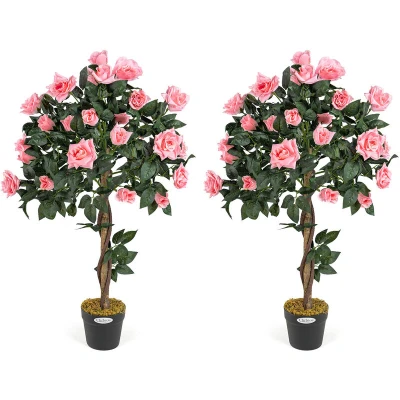 CHRISTOW 2 Artificial Rose Trees Pink Flowers Twisted Trunk Potted Indoor Outdoor 3ft (Pair)