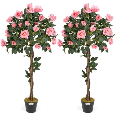 CHRISTOW 2 Artificial Rose Trees Pink Flowers Twisted Trunk Potted Indoor Outdoor 4ft (Pair)