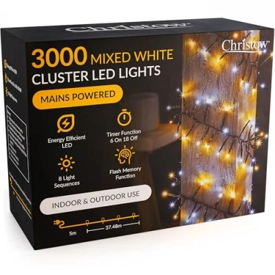 3000 MIXED WHITE LED CLUSTER LIGHTS: Make your home shine sparkly and bright with these Christow Christmas Cluster Lights. With 3000 micro LEDs across a 37.48m lit length, they’re perfect for bringing a festive glow to trees, rooflines, fences, and more – indoors or outdoors. ULTRA-BRIGHT & ENERGY EFFICIENT: Designed with 3000 white and warm white micro LEDs clustered closely together for a fuller, denser look that sparkles beautifully from every angle. The 3mm bulbs shine brighter than standard LEDs while remaining energy efficient and low cost to run. MULTI-ACTION (8 SETTINGS): Love a bit of festive sparkle? Press the button on the transformer plug to choose from 8 light sequences, ranging from twinkly effects to a normal static glow. Fitted with a memory chip to remember the last setting you selected when they come back on. TIMER FUNCTION (6HRS ON/18HRS OFF): No need to worry about turning the lights on and off. Simply activate the timer and they'll automatically light up at the same time every night. Plus, they'll automatically turn off after six hours. You can also manually turn them on and off. UK MAINS POWERED WITH 5M CABLE: Lights are mains powered with an IP20-rated plug for indoor sockets only. A 5m green cable gives you the flexibility to plug them indoors if displaying them outside, while the dark green colour blends discreetly with trees and foliage at night.