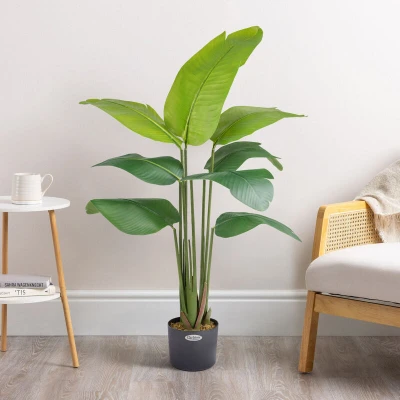 Give your home a sun-kissed, tropical feel with this Christow Artificial Banana Tree. Designed with upright stalks and large, fanning, bright green leaves, it looks every bit as stunning as a real banana tree. Plus, it requires no water, sunlight, or pruning, making it perfect for plant novices and those who lack green fingers. Pre-potted for easy display, it comes in a choice of 4ft or 5ft tall to suit your desired location. Feel-Real PEVA Leaves For a real-touch feel, each banana leaf has a durable, high-quality PEVA plastic design. Each leaf also features small, intricate tears to perfectly capture the natural, weathered look of real banana leaves. Weighted Faux Cement Pot Each tree comes in a stylish faux cement pot, weighted with concrete, and covered in a layer of moss for an attractive finish. If displaying the tree outside, we advise repotting it in a heavier pot for wind-resistance. Create Your Perfect Look The leaves differ in size and shape for to mimic the growth of a real