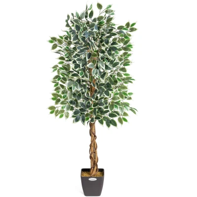 General description Love a bit of natural greenery but lack green fingers? Look no further than this Artificial Variegated Ficus Tree. It requires no sunlight, water, or pruning, so you don't need to worry about it dying of neglect. Plus, it looks every bit as stunning as a real tree and comes pre-potted for easy display. Technical specifications Height: 150cm (5ft) Leaf material: PEVA Pot material: Faux cement, weighted with concrete Leaf colors: Three shades of green Trunk material: Natural wood Compatibility and accessories Suitable for indoor and outdoor display UV protective spray recommended for outdoor use For outdoor display, consider repotting in a heavier pot for extra wind-resistance Installation Pre-assembled; simply straighten the branches and display Usage Ideal for brightening up homes, offices, restaurants, and outdoor spaces