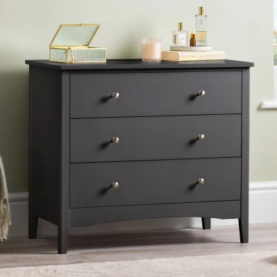 This Ilsington chest of drawers combines a clean, classic look with modern functionality. Painted neutral white, it pairs perfectly with both dark and lighter décor, as well as traditional and modern rooms. Plus, it has three spacious drawers to easily store and organise your clothes and belongings. Sturdy MDF with White Painted Finish Made from high-quality MDF with an easy-clean, white-painted finish. Because white is a neutral colour, it pairs perfectly with any colour scheme, as well as traditional and modern rooms. Traditional Style, Modern Appeal Designed with tapered legs and a curved bottom panel, combining traditional style with modern appeal. Rounded at the front for a softer finish but squared at the back to sit neatly against a wall. 3 Drawers with Brushed Chrome Handles Designed with smooth-gliding metal runners to easily open, plus brushed chrome handles for a stylish, modern touch. Each drawer has H10.3cm x W65cm x D28.6cm of internal storage space. Easy to Assemble