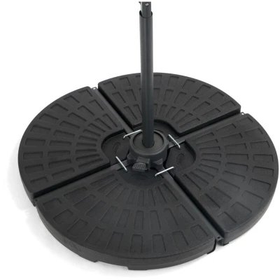 ManoManoGENERAL DESCRIPTION This Fan-Shaped 4-Piece Cantilever Parasol Base is designed to stabilize cantilever and banana parasols with a cross-base height of 4.5cm to 6cm. The base consists of four parts that fit together in an attractive fan shape. Each part can be filled with water or sand for added strength and stability. TECHNICAL SPECIFICATIONS Weight when filled with water: 13kg per part, 52kg total Weight when filled with sand: 16.5kg per part, 66kg total Material: Weather-resistant high-density polyethylene Size of each section: 48cm x 48cm x 7.5cm COMPATIBILITY AND ACCESSORIES Metal U-locks are included to secure the four parts together, suitable for parasols with a cross-base height of 6cm.
