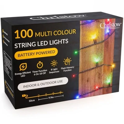 100 MULTI-COLOURED LED STRING LIGHTS: Create a super colourful and sparkly display with these Battery-Powered LED String Lights from Christow. Perfect for Christmas, celebrations, and home and garden décor, the lights contain 100 multi-coloured LEDs and have a lit length of 10m. ULTRA-BRIGHT ENERGY EFFICENT LEDS: 100 x 5mm LEDs are ultra-bright to produce a stronger, brighter glow and stand out spectacularly from a distance. Despite being super bright, the LEDs are also low power and energy efficient. So, the batteries require less regular replacement. 8 FLASH FEATURES & TIMER FUNCTION: Select from 8 flash features to create a sparkly display (7 flash effects, plus static). Fitted with a memory chip to memorise the last setting selected. Plus, a timer function to automatically light up at any time you choose (6hrs on/18hrs off). OUTDOOR SAFE BATTERY PACK: The lights are battery powered with an outdoor-safe battery pack and 50cm cable to the first bulb. With no socket to restrict you, you can easily place them anywhere you want. Cable is green to blend with trees, bushes, and appear less visible at night. RECYCLABLE KRAFT BOX PACKAGING: Battery lights come in a recyclable Kraft box which is purposefully compact to reduce its environmental impact. Other than a small amount of Sellotape, the box contains no plastics with plastic ties substituted for paper ties instead.