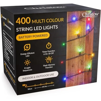 400 MULTI-COLOURED LED STRING LIGHTS: Create a super colourful and sparkly display with these Battery LED String Lights from Christow. Perfect for Christmas, celebrations, and home and garden décor, the lights contain 400 multi-coloured LEDs and have a lit length of 40m. ULTRA-BRIGHT ENERGY EFFICENT LEDS: 400 x 5mm LEDs are ultra-bright to produce a stronger, brighter glow and stand out spectacularly from a distance. Despite being super bright, the LEDs are also low power and energy efficient. So, the batteries require less regular replacement. 8 FLASH FEATURES & TIMER FUNCTION: Select from 8 flash features to create a sparkly display (7 flash effects, plus static). Fitted with a memory chip to memorise the last setting selected. Plus, a timer function to automatically light up at any time you choose (6hrs on/18hrs off). OUTDOOR SAFE BATTERY PACK: The lights are battery powered with an outdoor-safe battery pack and 50cm cable to the first bulb. With no socket to restrict you, you can easily place them anywhere you want. Cable is green to blend with trees, bushes, and appear less visible at night. RECYCLABLE KRAFT BOX PACKAGING: Battery lights come in a recyclable Kraft box which is purposefully compact to reduce its environmental impact. Other than a small amount of Sellotape, the box contains no plastics with plastic ties substituted for paper ties instead.
