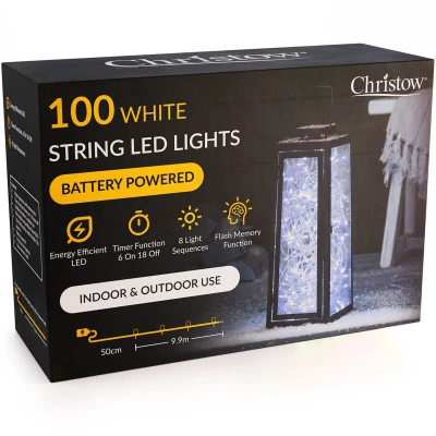 General description Make the festive season sparkle with these Christow LED Battery Christmas Lights. Suitable for indoors and outdoors, they come in a choice of sizes and colours to create your dream display. Choose from 50 LEDs (5m lit length), 100 LEDs (10m lit length), or 200 LEDs (20m lit length), with options for white, warm white, or multi-coloured LEDs to match your Christmas décor. Technical specifications LED Types: 5mm ultra-bright LEDs Available Sizes: 50 LEDs (5m lit length), 100 LEDs (10m lit length), 200 LEDs (20m lit length) Battery Requirements: 50/100 LEDs require 2 x AA batteries (not included), 200 LEDs require 3 x AA batteries (not included) Timer Function: 6 hours on / 18 hours off Bulb Spacing: 10cm Clear Cable Length: 50cm to first bulb Usage 8 flash features including 7 twinkly effects and static glow Memory function to remember the last setting selected when turned back on Perfect for indoor and outdoor displays, including decorative arrangements in vases