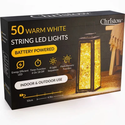 General description Make the festive season sparkle with these Christow LED Battery Christmas Lights. Suitable for indoors and outdoors, they come in a choice of sizes and colours to create your dream display. Choose from 50 LEDs (5m lit length), 100 LEDs (10m lit length), or 200 LEDs (20m lit length), with options for white, warm white, or multi-coloured LEDs to match your Christmas décor. Technical specifications LED Types: 5mm ultra-bright LEDs Sizes: 50 LEDs (5m lit length), 100 LEDs (10m lit length), 200 LEDs (20m lit length) Battery Requirements: 50/100 LEDs require 2 x AA batteries (not included), 200 LEDs require 3 x AA batteries (not included) Timer Function: 6 hours on / 18 hours off Bulb Spacing: 10cm Clear Cable Length: 50cm to first bulb Usage The lights feature 8 flash functions, including 7 twinkly effects and static glow, allowing you to create a magical display. The timer function ensures the lights automatically turn on at your desired time and off after 6 hours,