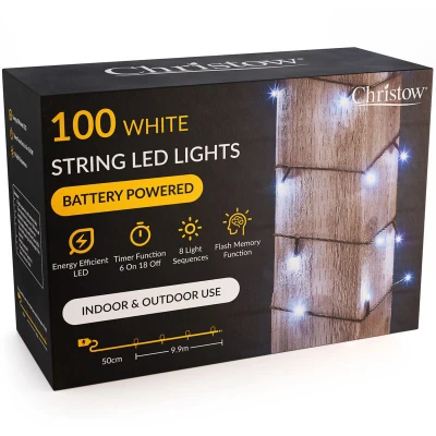 General description Give your home some festive sparkle with these Christow LED Battery Christmas Lights. Suitable for indoors and outdoors, they come in a variety of sizes and colors to create your dream display. Choose from 50 LEDs (5m lit length), 100 LEDs (10m), 200 LEDs (20m), 300 LEDs (30m), 400 LEDs (40m), or 600 LEDs (60m), with options for white, warm white, or multi-coloured lights. Technical specifications LED Types: 5mm ultra-bright LEDs Battery Requirements: 50 LEDs require 3 x AA batteries (not included); 100/200/300 LEDs require 4 x AA batteries (not included); 400/600 LEDs require 3 x C Cell batteries (not included) Lit Lengths: 50 LEDs = 5m, 100 LEDs = 10m, 200 LEDs = 20m, 300 LEDs = 30m, 400 LEDs = 40m, 600 LEDs = 60m Bulb Spacing: 10cm Timer Function: 6 hours on / 18 hours off Flash Features: 8 (7 twinkly effects + static glow) Compatibility and accessories Battery pack is outdoor-safe with a 50cm cable to the first bulb Dark green cable blends seamlessly with