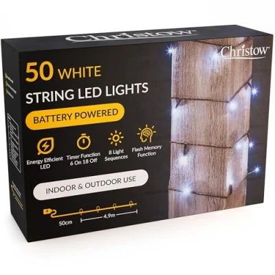 50 WHITE LED STRING LIGHTS: Make your home look sparkly and bright with these Battery-Powered LED String Lights from Christow. Perfect for Christmas, weddings, celebrations, and home and garden décor, the lights contain 50 white LEDs and have a lit length of 5m. ULTRA-BRIGHT ENERGY EFFICENT LEDS: 50 x 5mm LEDs are ultra-bright to produce a stronger, brighter glow and stand out spectacularly from a distance. Despite being super bright, the LEDs are also low power and energy efficient. So, the batteries require less regular replacement. 8 FLASH FEATURES & TIMER FUNCTION: Select from 8 flash features to create a sparkly display (7 flash effects, plus static). Fitted with a memory chip to memorise the last setting selected. Plus, a timer function to automatically light up at any time you choose (6hrs on/18hrs off). OUTDOOR SAFE BATTERY PACK: The lights are battery powered with an outdoor-safe battery pack and 50cm cable to the first bulb. With no socket to restrict you, you can easily place them anywhere you want. Cable is green to blend with trees, bushes, and appear less visible at night. RECYCLABLE KRAFT BOX PACKAGING: Battery lights come in a recyclable Kraft box which is purposefully compact to reduce its environmental impact. Other than a small amount of Sellotape, the box contains no plastics with plastic ties substituted for paper ties instead.