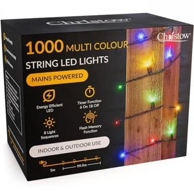 1000 MULTI-COLOURED LED STRING LIGHTS: Create a super colourful and sparkly display with these Ultra-Bright LED String Lights from Christow. Perfect for Christmas, weddings, garden décor, and more, the lights contain 1000 multi-coloured LEDs and have a lit length of 100m. ULTRA-BRIGHT ENERGY EFFICENT LEDS: 1000 x 5mm LEDs are ultra-bright to produce a stronger, brighter glow and stand out spectacularly from a distance. Despite being super bright, they're also low power, energy efficient, and low cost to run. Plus, waterproof to safely use outdoors. 8 FLASH FEATURES & TIMER FUNCTION: Select from 8 flash features to create a sparkly display (7 flash effects, plus static). Fitted with a memory chip to memorise the last setting selected. Plus, a timer function to automatically light up at any time you choose (6hrs on/18hrs off). MAINS POWERED WITH 5M CABLE: Lights are mains powered with a 5m cable for flexible display. Plug is suitable for indoors, plus IP60-rated outdoor sockets. Cabling is green to blend with surroundings at night. Great for indoor and outdoor walls, trees, banisters, and more! RECYCLABLE KRAFT BOX PACKAGING: Christmas string lights come in a recyclable Kraft box which is purposefully compact to reduce its environmental impact. Other than a small amount of Sellotape, the box contains no plastics with plastic ties substituted for paper ties instead.