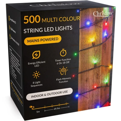 CHRISTOW Christmas Fairy Lights, Multi Coloured LED String Lighting with Timer, Indoor & Outdoor, Tree Mains Operated, 8 Light Modes Flashing Static, Green Cable (500 / 50m Lit Length)