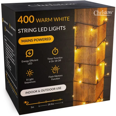 General description Make your home look super sparkly and bright with these LED Christmas String Lights. Suitable for both indoors and outdoors, they come in a variety of sizes and colors to create your perfect Christmas display. Choose from options including 50 LEDs (5m lit length), 100 LEDs (10m), 200 LEDs (20m), 300 LEDs (30m), 400 LEDs (40m), or 600 LEDs (60m), with color choices of white, warm white, or multi-colored. Technical specifications Number of LEDs: 50, 100, 200, 300, 400, or 600 Lit length: 5m, 10m, 20m, 30m, 40m, or 60m Power source: Mains powered with UK transformer plug Cable length: 5m IP rating: IP20 for indoor use, suitable for IP60-rated outdoor sockets Usage 8 flash features including 7 twinkly effects and static function Timer function: 6 hours on / 18 hours off Energy efficient and low cost to run Other information Dark green cable blends seamlessly with surroundings Supplied in recyclable Kraft box with minimal plastic