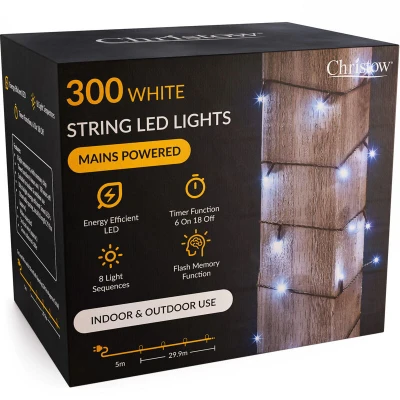CHRISTOW Christmas Fairy Lights, White LED String Lighting with Timer, Indoor & Outdoor, Tree Mains Operated, 8 Light Modes Flashing Static, Green Cable (300 / 30m Lit Length)