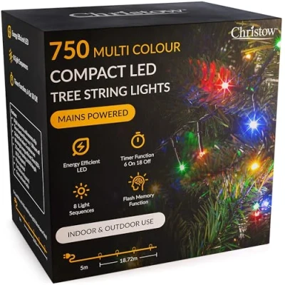 SPARKLY & BRIGHT 6FT CHRISTMAS TREE LIGHTS: Got a 6ft Christmas tree? Give it the wow factor with these Multi-Coloured LED Lights from Christow. With 750 LEDs across an 18.72m lit length, they’re the perfect size, bulb count, and brightness for a 6ft tree or slim 7ft pencil tree. ENERGY EFFICIENT MULTI-COLOURED LEDS: Each 3mm LED is smaller than a standard bulb for a more attractive, sparkly display. With 2.5cm spacing (closer than the usual 10cm), you get more bulbs per metre for extra brightness. Low power, energy efficient, and low cost to run. MULTI-ACTION (8 SETTINGS): Love a bit of festive sparkle? Press the button on the transformer plug to choose from 8 light sequences, ranging from twinkly effects to a normal static glow. Fitted with a memory chip to remember the last setting you selected when they come back on. TIMER FUNCTION (6HRS ON/18HRS OFF): No need to worry about turning the lights on and off. Simply activate the timer and they'll automatically light up at the same time every night. Plus, they'll automatically turn off after six hours. You can also manually turn them on and off. UK MAINS POWERED WITH 5M CABLE: Lights are mains powered with an IP20-rated plug for indoor sockets only. A 5m green cable gives you the flexibility to plug them indoors if displaying them outside, while the dark green colour blends discreetly with trees and foliage at night.