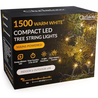 CHRISTOW Christmas Tree Lights, Compact Warm White LED Fairy String Lights with Timer, 8 Light Modes, Indoor & Outdoor, Mains Operated, Green Cable (1500 / 37.47m Lit Length for 8ft Xmas Tree)