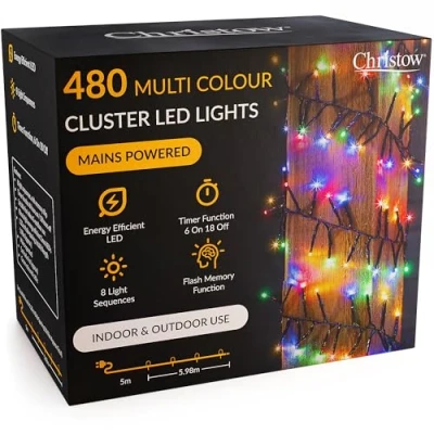 480 MULTI-COLOURED LED CLUSTER LIGHTS: Make your home shine sparkly and bright with these Christow Christmas Cluster Lights. With 480 micro LEDs across a 5.98mm lit length, they’re perfect for bringing a festive glow to trees, rooflines, banisters, and more – indoors or outdoors. ULTRA-BRIGHT & ENERGY EFFICIENT: Designed with 480 multi-coloured micro LEDs clustered closely together for a fuller, denser look that sparkles beautifully from every angle. The 3mm bulbs shine brighter than standard LEDs while remaining energy efficient and low cost to run. MULTI-ACTION (8 SETTINGS): Love a bit of festive sparkle? Press the button on the transformer plug to choose from 8 light sequences, ranging from twinkly effects to a normal static glow. Fitted with a memory chip to remember the last setting you selected when they come back on. TIMER FUNCTION (6HRS ON/18HRS OFF): No need to worry about turning the lights on and off. Simply activate the timer and they'll automatically light up at the same time every night. Plus, they'll automatically turn off after six hours. You can also manually turn them on and off. UK MAINS POWERED WITH 5M CABLE: Lights are mains powered with an IP20-rated plug for indoor sockets only. A 5m green cable gives you the flexibility to plug them indoors if displaying them outside, while the dark green colour blends discreetly with trees and foliage at night.