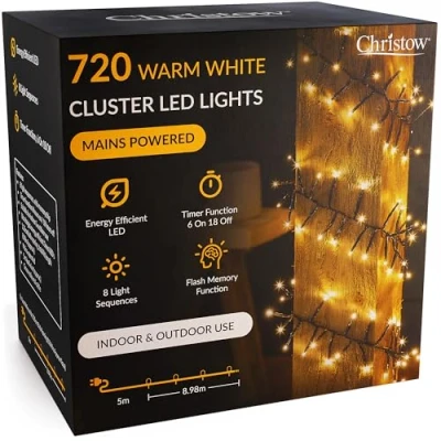 720 WARM WHITE LED CLUSTER LIGHTS: Make your home shine sparkly and bright with these Christow Christmas Cluster Lights. With 720 micro LEDs across an 8.98m lit length, they’re perfect for bringing a festive glow to trees, rooflines, banisters, and more – indoors or outdoors. ULTRA-BRIGHT & ENERGY EFFICIENT: Designed with 720 warm white micro LEDs clustered closely together for a fuller, denser look that sparkles beautifully from every angle. The 3mm bulbs shine brighter than standard LEDs while remaining energy efficient and low cost to run. MULTI-ACTION (8 SETTINGS): Love a bit of festive sparkle? Press the button on the transformer plug to choose from 8 light sequences, ranging from twinkly effects to a normal static glow. Fitted with a memory chip to remember the last setting you selected when they come back on. TIMER FUNCTION (6HRS ON/18HRS OFF): No need to worry about turning the lights on and off. Simply activate the timer and they'll automatically light up at the same time every night. Plus, they'll automatically turn off after six hours. You can also manually turn them on and off. UK MAINS POWERED WITH 5M CABLE: Lights are mains powered with an IP20-rated plug for indoor sockets only. A 5m green cable gives you the flexibility to plug them indoors if displaying them outside, while the dark green colour blends discreetly with trees and foliage at night.