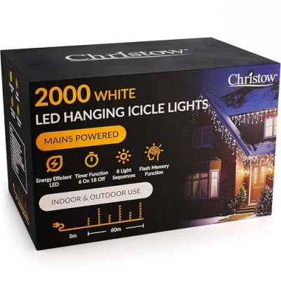 2000 WHITE LED ICICLE LIGHTS: Make your home look like a winter wonderland with these White Icicle Christmas Lights from Christow. Lit by strands of hanging LEDs to resemble shiny icicles. Perfect for rooflines, guttering, banisters, and more. 2000 white LEDs. 60m lit length. BRIGHT ENERGY EFFICIENT LEDS: Beautifully lit by strands of bright 5mm LEDs to resemble sparkly, shimmery icicles and create an enchanting light display. LEDs are low power, energy efficient, and low cost to run. Strands alternate in length from 60cm (6 LEDs) to 30cm (3 LEDs). FLASH MEMORY FUNCTION: Love a bit of festive sparkle? Press the button on the transformer plug to choose from 8 light sequences, ranging from twinkly effects to a normal static glow. Fitted with a memory chip to remember the last setting you selected when they come back on. TIMER FUNCTION (6HRS ON/18HRS OFF): No need to worry about turning the lights on and off. Simply activate the timer and they'll automatically light up at the same time every night. Plus, they'll automatically turn off after six hours. You can also manually turn them on and off. UK MAINS POWERED WITH 5M CABLE: Lights are mains powered with an IP20-rated plug for indoor sockets only. Designed with a 5m long cable, giving you plenty of length to plug the lights indoors if displaying them outside. Cabling is white to blend in with white guttering.