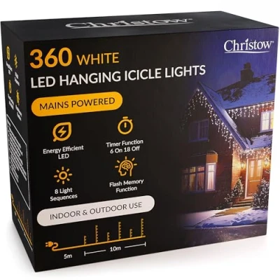 360 WHITE LED ICICLE LIGHTS: Make your home look like a winter wonderland with these White Icicle Christmas Lights from Christow. Lit by strands of hanging LEDs to resemble shiny icicles. Perfect for rooflines, guttering, banisters, and more. 360 bright white LEDs. 10m lit length. BRIGHT ENERGY EFFICIENT LEDS: Beautifully lit by strands of bright 5mm LEDs to resemble sparkly, shimmery icicles and create an enchanting light display. LEDs are low power, energy efficient, and low cost to run. Strands alternate in length from 60cm (6 LEDs) to 30cm (3 LEDs). FLASH MEMORY FUNCTION: Love a bit of festive sparkle? Press the button on the transformer plug to choose from 8 light sequences, ranging from twinkly effects to a normal static glow. Fitted with a memory chip to remember the last setting you selected when they come back on. TIMER FUNCTION (6HRS ON/18HRS OFF): No need to worry about turning the lights on and off. Simply activate the timer and they'll automatically light up at the same time every night. Plus, they'll automatically turn off after six hours. You can also manually turn them on and off. UK MAINS POWERED WITH 5M CABLE: Lights are mains powered with an IP20-rated plug for indoor sockets only. Designed with a 5m long cable, giving you plenty of length to plug the lights indoors if displaying them outside. Cabling is white to blend in with white guttering.