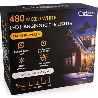 480 MIXED WHITE LED ICICLE LIGHTS: Make your home look like a winter wonderland with these Mixed White Icicle Lights from Christow. Lit by strands of hanging LEDs to resemble shiny icicles. Perfect for rooflines, guttering, banisters, and more. 480 LEDs. 15m lit length. BRIGHT ENERGY EFFICIENT LEDS: Beautifully lit by strands of bright 5mm LEDs to resemble sparkly, shimmery icicles and create an enchanting light display. LEDs are low power, energy efficient, and low cost to run. Strands alternate in length from 60cm (6 LEDs) to 30cm (3 LEDs). FLASH MEMORY FUNCTION: Love a bit of festive sparkle? Press the button on the transformer plug to choose from 8 light sequences, ranging from twinkly effects to a normal static glow. Fitted with a memory chip to remember the last setting you selected when they come back on. TIMER FUNCTION (6HRS ON/18HRS OFF): No need to worry about turning the lights on and off. Simply activate the timer and they'll automatically light up at the same time every night. Plus, they'll automatically turn off after six hours. You can also manually turn them on and off. UK MAINS POWERED WITH 5M CABLE: Lights are mains powered with an IP20-rated plug for indoor sockets only. Designed with a 5m long cable, giving you plenty of length to plug the lights indoors if displaying them outside. Cabling is white to blend in with white guttering.