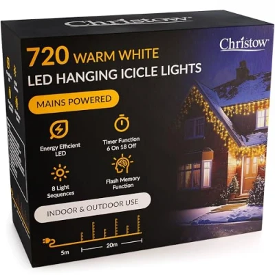 720 WARM WHITE LED ICICLE LIGHTS: Make your home look like a winter wonderland with these Warm White Icicle Lights from Christow. Lit by strands of hanging LEDs to resemble shiny icicles. Perfect for rooflines, guttering, banisters, and more. 720 LEDs with 20m lit length. BRIGHT ENERGY EFFICIENT LEDS: Beautifully lit by strands of bright 5mm LEDs to resemble sparkly, shimmery icicles and create an enchanting light display. LEDs are low power, energy efficient, and low cost to run. Strands alternate in length from 60cm (6 LEDs) to 30cm (3 LEDs). FLASH MEMORY FUNCTION: Love a bit of festive sparkle? Press the button on the transformer plug to choose from 8 light sequences, ranging from twinkly effects to a normal static glow. Fitted with a memory chip to remember the last setting you selected when they come back on. TIMER FUNCTION (6HRS ON/18HRS OFF): No need to worry about turning the lights on and off. Simply activate the timer and they'll automatically light up at the same time every night. Plus, they'll automatically turn off after six hours. You can also manually turn them on and off. UK MAINS POWERED WITH 5M CABLE: Lights are mains powered with an IP20-rated plug for indoor sockets only. Designed with a 5m long cable, giving you plenty of length to plug the lights indoors if displaying them outside. Cabling is white to blend in with white guttering.