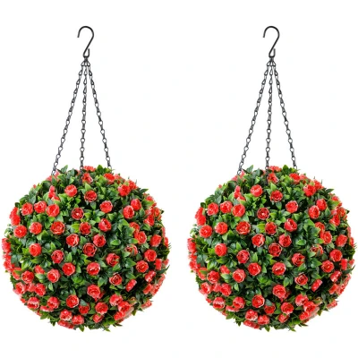General description Add a gorgeous splash of colour to your outdoor living space with a pair of Artificial Rose Topiary Balls. Covered in colourful rose flowers and lush, lifelike leaves, these decorative balls can be displayed either side of a door for a welcoming display or placed in pots to brighten up a balcony, patio, or decking. Choose from a variety of colours including white roses, a mix of red and white roses, or a mix of pink and white roses, each designed to create the illusion of blooming flowers for a beautiful, natural look. Technical specifications Pack of 2 artificial rose flower topiary balls Diameter of balls: 28cm Chain length: 40cm Each ball contains 202 rose flowers and 202 leaves Durable, water-resistant PE leaves and flowers UV protected to prevent fading in sunlight Powder-coated steel chains for rust resistance Other information Each topiary ball comes in two halves with poppers and holes for easy assembly Hanging chains are pre-attached for immediate display