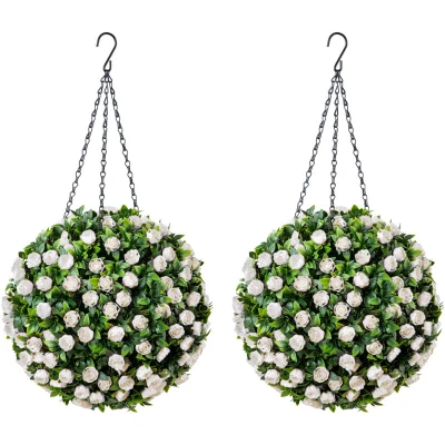 General description Add a gorgeous splash of colour to your outdoor living space with a pair of Artificial Rose Topiary Balls. Covered in colourful rose flowers and lush, lifelike leaves, these decorative balls can be displayed either side of a door for a welcoming display or placed in pots to brighten up a balcony, patio, or decking. Choose from a variety of colours including white roses, a mix of red and white roses, or a mix of pink and white roses, creating the illusion of blooming flowers for a beautiful, natural look. Technical specifications Pack of 2 artificial rose flower topiary balls Diameter of balls: 28cm Chain length: 40cm Each ball contains 202 rose flowers and 202 leaves Durable, water-resistant PE leaves and flowers UV protected to prevent fading in sunlight Powder-coated steel chains for rust resistance Triple hanging chain with hook for easy hanging Installation Each topiary ball comes in two halves with poppers and holes for easy assembly The hanging chains are