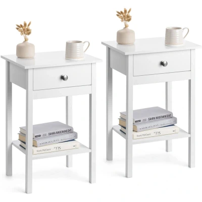 ManoManoGeneral description Store your bedside essentials in style with this Pair of Bedside Tables in White. Featuring a compact design, these tables are perfect for any bedroom, living room, or hallway, providing both functionality and a contemporary look. Technical specifications Material: Durable composite wood (MDF) Dimensions when assembled: H60cm x W40cm x D30cm Drawer dimensions (internal): H9cm x W26.7cm x D23cm (approx.) Installation Easy to assemble with flat-packed design Instructions and fixings included Recommended tool: Philips screwdriver Usage Ideal for storing bedside essentials Surface space suitable for an alarm clock, reading lamp, and books Raised shelf for additional storage Other information Easy to clean with glossy wipe-clean paint Simply wipe with a damp cloth and buff with a microfibre cloth