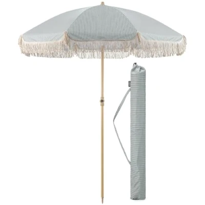 2M COTTON TASSEL PARASOL: Bring a touch of summer chic to your garden with this 2m Tassel Parasol from Christow. Designed with Sage Green stripes and fringed with cotton tassels for a stylish, vintage look. Plus, it's portable to shade you from the sun wherever you go. Great for the beach, picnics, garden use, and more. UV50+ PROTECTIVE CANOPY: Canopy is made from heavy-duty 180g/M2 polyester for superior strength and durability. Boasts a UV50+ rating to provide ultimate protection from the sun's harmful UV rays. Plus, it's water-resistant and fast-drying. With a diameter of 2m, it's perfect for shading a 2-seater bistro table. TILTING MECHANISM TO ANGLE CANOPY: Features a push-button to easily open the canopy, plus a tilt mechanism to easily angle the canopy. Perfect for shading you from the low-lying sun. So, you can shade yourself from the sunshine all day long. For rust-resistance, the tilt mechanism has a durable zinc construction. 38MM SCREW END POLE: Strong steel pole with light wood effect finish pairs beautifully with wooden garden furniture. Fits parasol bases with a 38mm adaptor (base not included). Plus, it's screw-shaped at the bottom, allowing you to easily screw it into soft, sandy ground. Perfect if you're taking it to the beach! BAG INCLUDED TO EASILY CARRY: Pole comes in two parts which screw together for easy assembly. Packs into a compact size to easily store and carry in the drawstring bag included. Measures 113cm x 13cm x 13cm and weighs 2kg when stored inside the bag, making it lightweight to carry on outdoor adventures.