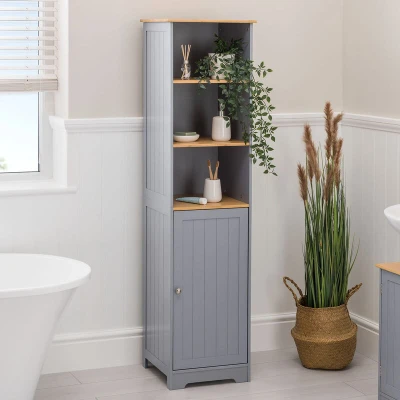ManoManoGeneral description This Grey Tallboy Bathroom Cabinet is perfect for utilizing the full height of your bathroom and freeing up valuable space. It features a cupboard and three shelves to store your essentials, all finished in a stylish grey with bamboo shelves for a beautiful, natural look. Technical specifications Material: Durable MDF Finish: Smooth, grey-painted Dimensions: H160cm x W40cm x D38cm (approx.) Storage: Cupboard with 2 levels of storage and 3 open bamboo shelves Open shelf dimensions: 25cm tall, 40cm wide, and 38cm deep (approx.) Installation Delivered flat-packed with minimal parts Includes full fixings and clear instructions for easy assembly No tools needed other than a Phillips head screwdriver Usage Perfect for storing and organizing bathroom essentials Open shelves can be used for decorative objects to brighten up your bathroom