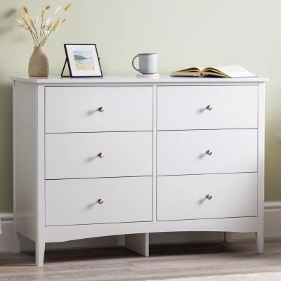 This Ilsington chest of drawers combines a clean, classic look with modern functionality. Painted neutral white, it pairs perfectly with both dark and lighter décor, as well as traditional and modern rooms. Plus, it has six drawers to easily store and organise your clothes and belongings. Sturdy MDF with White Painted Finish Made from high-quality MDF with an easy-clean, white-painted finish. Because white is a neutral colour, it pairs perfectly with any colour scheme, as well as traditional and modern rooms. Traditional Style, Modern Appeal Designed with tapered legs and a curved bottom panel, combining traditional style with modern appeal. Rounded at the front for a softer finish but squared at the back to sit neatly against a wall. 3 Drawers with Brushed Chrome Handles Designed with smooth-gliding metal runners to easily open, plus brushed chrome handles for a stylish, modern touch. Each drawer has H10.3cm x W65cm x D28.6cm of internal storage space. Easy to Assemble with Slimline