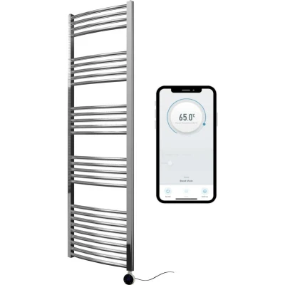 Chrome Electric Smart WiFi Controlled Heated Towel Rail 500mm W x 1600mm H Curved 7 Day Programmable Timer App Compatibility