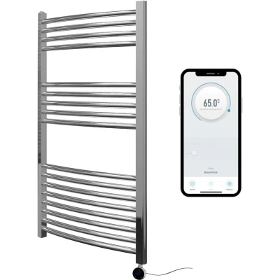 Chrome Electric Smart WiFi Controlled Heated Towel Rail 600mm w x 1000mm h Curved 7 Day Programmable Timer App Compatibility
