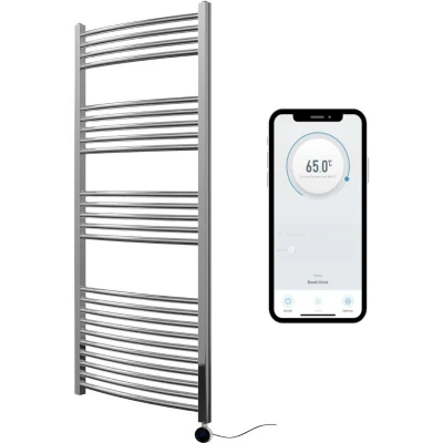 Chrome Electric Smart WiFi Controlled Heated Towel Rail 600mm W x 1400mm H Curved 7 Day Programmable Timer App Compatibility