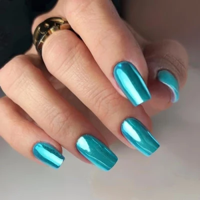 Chrome False Nails Medium, SXVME Metallic Teal Blue Press on Short Medium Square, Glitter Shine Fake Glue Cute, Mirror Acrylic Stick for Women Daily & Party Wear