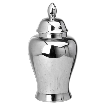 General description This is the Chrome Large Ginger Jar. This stylish, handcrafted ginger jar in a versatile chrome glaze is the perfect finishing touch for the home. Ginger jars are fantastic not only for small storage and ornamental value but the slim neck also enables the elegant display of a small number of stems. This jar would look elegant styled alone or fabulous displayed as a pair for maximum impact. Technical specifications Length: 18 cm Width: 18 cm Height: 36 cm Weight: 1.46 kg CBM: 0.1100 Colour: Silver Material: Chrome Other information Matching, smaller vase available. Glossy chrome effect glaze adds a subtle glamour.