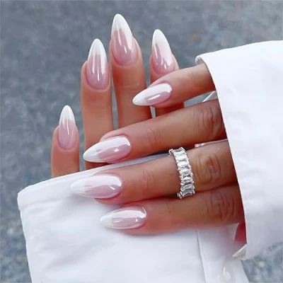 Chrome White French Tip False Nails Almond, SXVME Press on Medium, Glazed Fake on, Glitter Acrylic Natural Pink Stick for Women Daily Wear