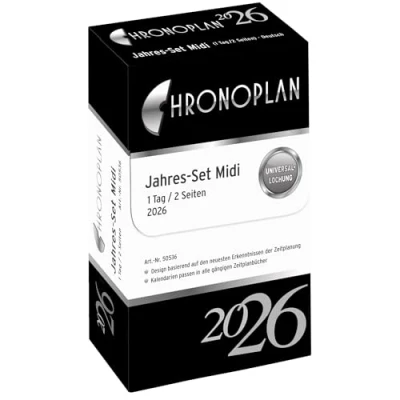 CHRONOPLAN Year set 2026: 365 daily plans with 1 day on 2 pages from January 2026 to December 2026 in handy midi format (96 x 172 mm) in a complete set for the whole year in a practical archive box Includes: wallet planner, 12 month plans, year plan 26/27, annual project plan 26/27, holiday plan, holidays D/A/CH, dimensions & weights, distances/currency table, postcode card D, etc. Well thought-out construction: definition of the respective daily goals, classification in priorities, division into appointments and tasks with variable time division up to 10 p.m. as well as planning the time requirements With universal hole for many common organisers: hole spacing: 19 mm - 19 mm - 51 mm - 19 mm - 19 mm / hole diameter: 5 mm Sustainable material: short-term calendars with 80 g/m², long-term calendars with 120 g/m² - FSC-certified paper from responsibly managed forests and other controlled sources