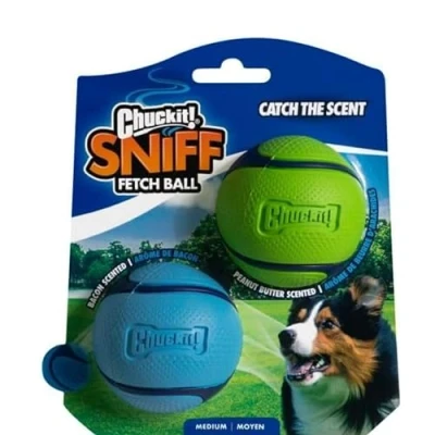 BACON AND PEANUT BUTTER SCENTED DOG BALLS: Entice your dogs to play with the bacon and peanut butter flavoured infused durable rubber balls TOUGH & DURABLE RUBBER BALL: Outlives your average tennis ball. Rubber ball for dogs has a textured surface for added grip and a thick rubber exterior for aggressive chewers, yet is soft on dog's mouths BOUNCE BALL: The Chuckit! Sniff Ball offers high bounce, buoyancy, visibility, and durability; This dog toy can be used in the water and is designed specifically for the game of fetch; Compatible with Chuckit Launchers EASY TO CLEAN: Dog ball toy's smooth, rubber surface resists mess and allows pet parents to easily wash off dirt or slobber BALL THROWER COMPATIBLE: Pair with our Chuckit! ball launchers for interactive play
