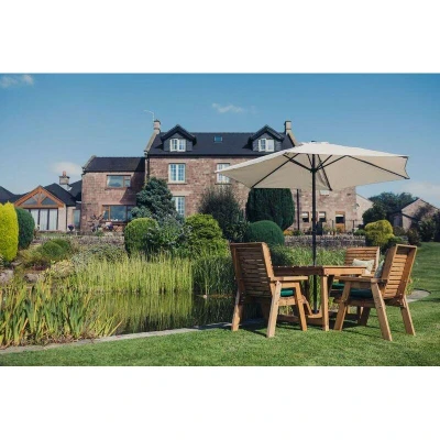 General description This Valley Table Set seats 4 and is designed with style, comfort, and durability in mind. It features a beautiful golden oak finish that adds natural charm to any outdoor space. The set consists of a square table and 4 chairs, all made from the finest certified Swedish Redwood. This product has been treated with a base coat for protection, ensuring long-lasting durability. To maintain its condition and protect against rot, it is recommended to re-treat the wood annually. Technical specifications Assembly: Partially assembled Width: 190 cm Height: 95 cm Depth: 190 cm Timber Profile - Seat (mm): 20 x 45 Timber Profile - Table top (mm): 95 x 20 Timber Profile - Legs (mm): 40 x 80 Timber Profile - Arms (mm): 40 x 80 Weight: 78 kg Other information Accessories such as seat cushions are not included and can be purchased separately. The wood has a base treatment with anti-fungal, anti-mould, and UV protection. Images may show accessories that are not included in the