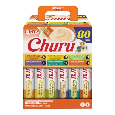 MADE WITH LUXURIOUS INGREDIENTS YOU CAN TRUST: Every Inaba product is made with yummy, human-grade ingredients including farm-raised chicken and/or wild-caught tuna KEEP OUR FELINE HYDRATED WITHOUT ADDING CALORIES: Each delicious, creamy Churu tube contains 91% moisture and only 6 calories (a tenth of the calories of traditional dry cat treats), which makes it a healthy snack you can feel good about feeding FREE OF THE BAD STUFF: Your feline friend is important to us, which is why we've kept things like grains, preservatives, artificial colours and carrageenan out of our cat treats, but we added things like Taurine to help with their overall health HAVE THEM EATING OUT OF YOUR HAND: These lickable purée meat tubes for cats were designed to be fed by hand, as an interactive way to spend time with your feline, but you can use as a wet/dry cat food topper or as a way to disguise medication