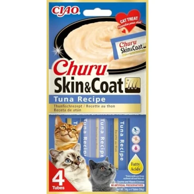 Churu Skin & Coat by INABA Cat Treat Tuna 1 Pack (4 x 14g total) / Soft Creamy Treat, Delicious Healthy Snack, Purée Food Topper, Natural, Grain Free