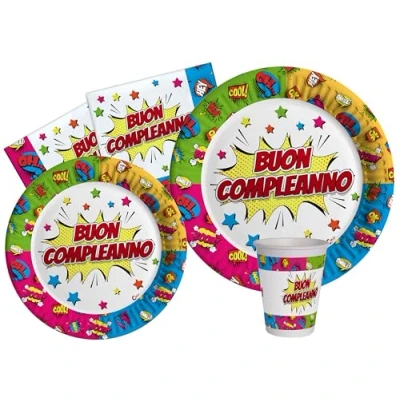 Comics Happy Birthday Party Range Contents: 8 plates Ø23 cm, 8 plates Ø18 cm, 8 glasses 250 ml, 20 napkins 33 x 33 cm Environmentally friendly compostable paper products comply with new regulations. Occasions: Birthday, Party, Theme Party, Anniversary, Celebration, Celebration, Arrangement, Events, Manufacturer: Ciao
