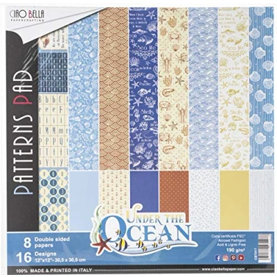 CBT017 - 12"x12" Patterns Pad Under the Ocean Ciao Bella Patterns Pad. 12"x12". 1 each of 8 double-sided papers. 1 designs plus one additional design in the cover with 3 cards. Ciao Bella paper collections are manufactured in Italy with organic inks on forest-friendly certified paper by a carefully selected team of specialist and traditional printing professionals. The versatile patterns and styles, original illustrations and exciting colour palettes mean the papers can be used for both scrapbooking, mixed media, arts and crafts or home decor. High quality certified Italian Paper. 190gsm. FSC Certified.